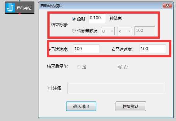 1. 启动马达模块有两种控制方式,一是使用时间控制,比如延时0.1秒,还可以使用传感器触发控制,比如设置某个传感器碰到某条线,然后再执行某个动作等。