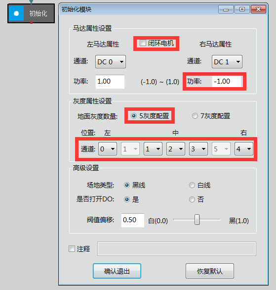 1. 初始化模块:去掉闭环电机选项,设置右马达功率为-1,设置5灰度传感器,并且通道为:0、1、2、3、4.